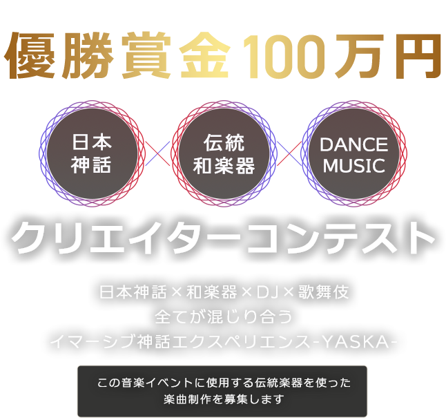 共に日本神話を現代にアップデートし、和楽器を使った曲で世界を驚かせたいという野心のある方を募集しています。伝統をリスペクトしつつ、最新のクラブミュージック(Techno/Gqom/Ambient等)で世界へ殴り込みをかけられるような、エッジの効いた作品をお待ちしています。
